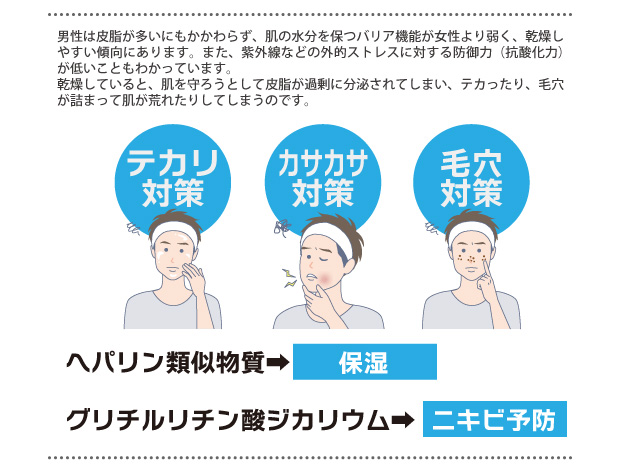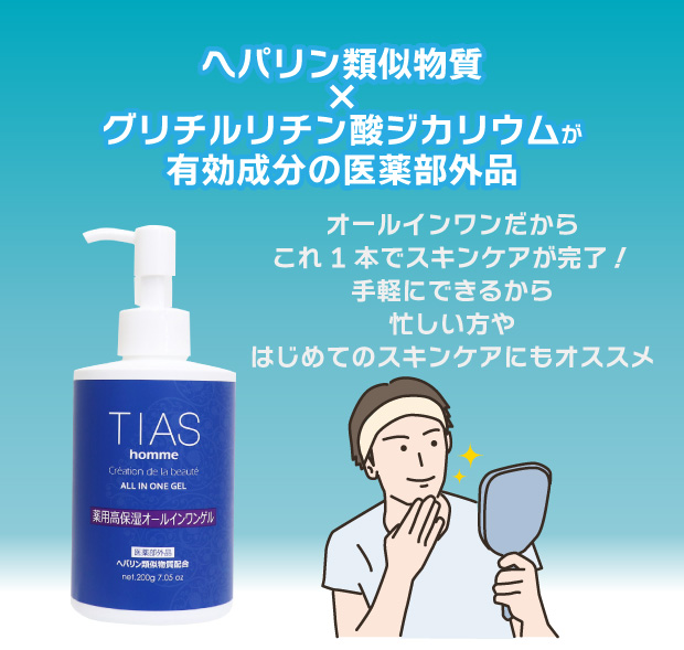 有効成分ヘパリン類似物質とグリチルリチン酸ジカリウムを配合した医薬部外品のオールインワンゲル。これ1本でお風呂上りや洗顔後のお肌ケアできるから、時間のない朝でも楽々です。しっとり潤うのに、お肌になじめばベタつかず、さらっとしたテクスチャーなので、べたつきが苦手な男性にもピッタリです。